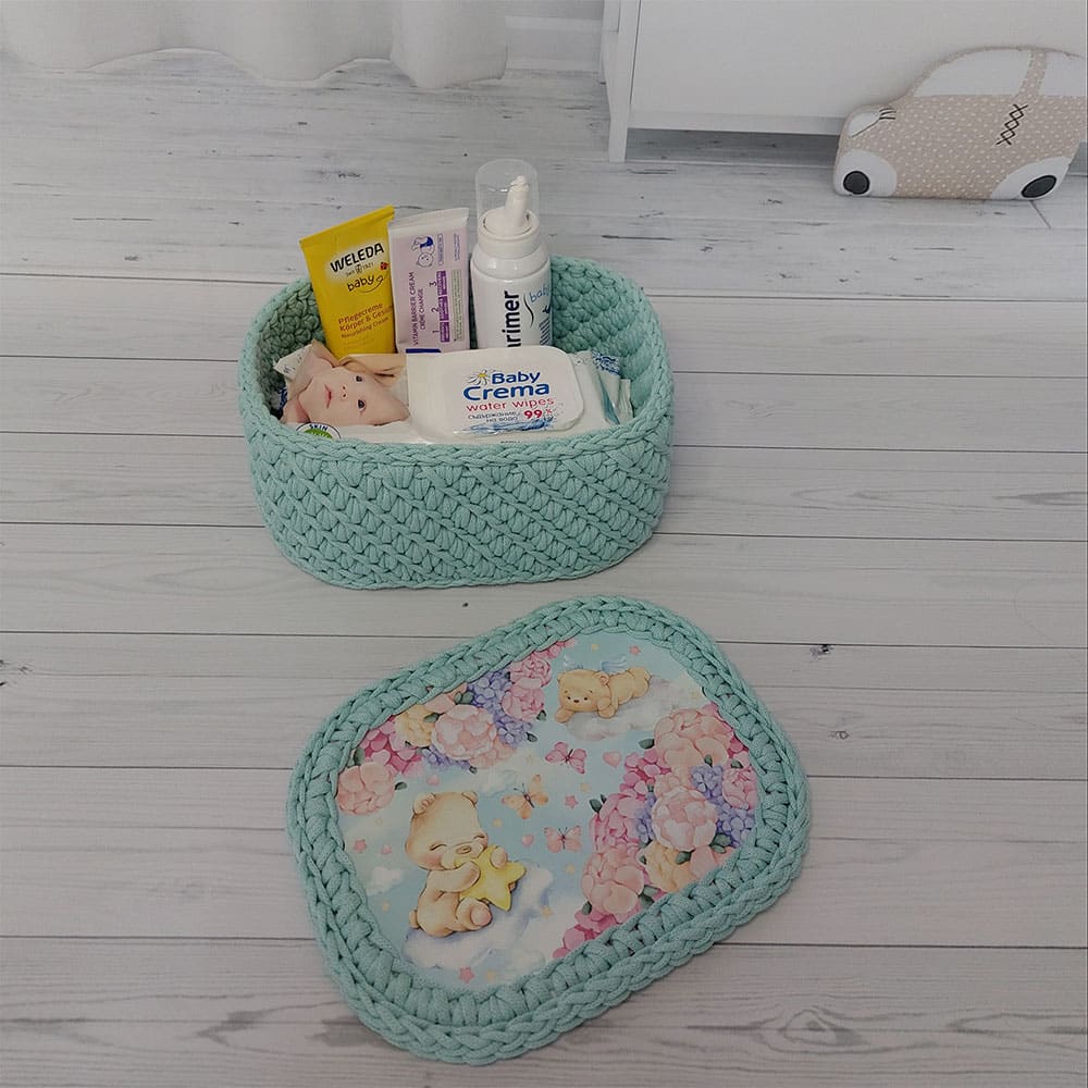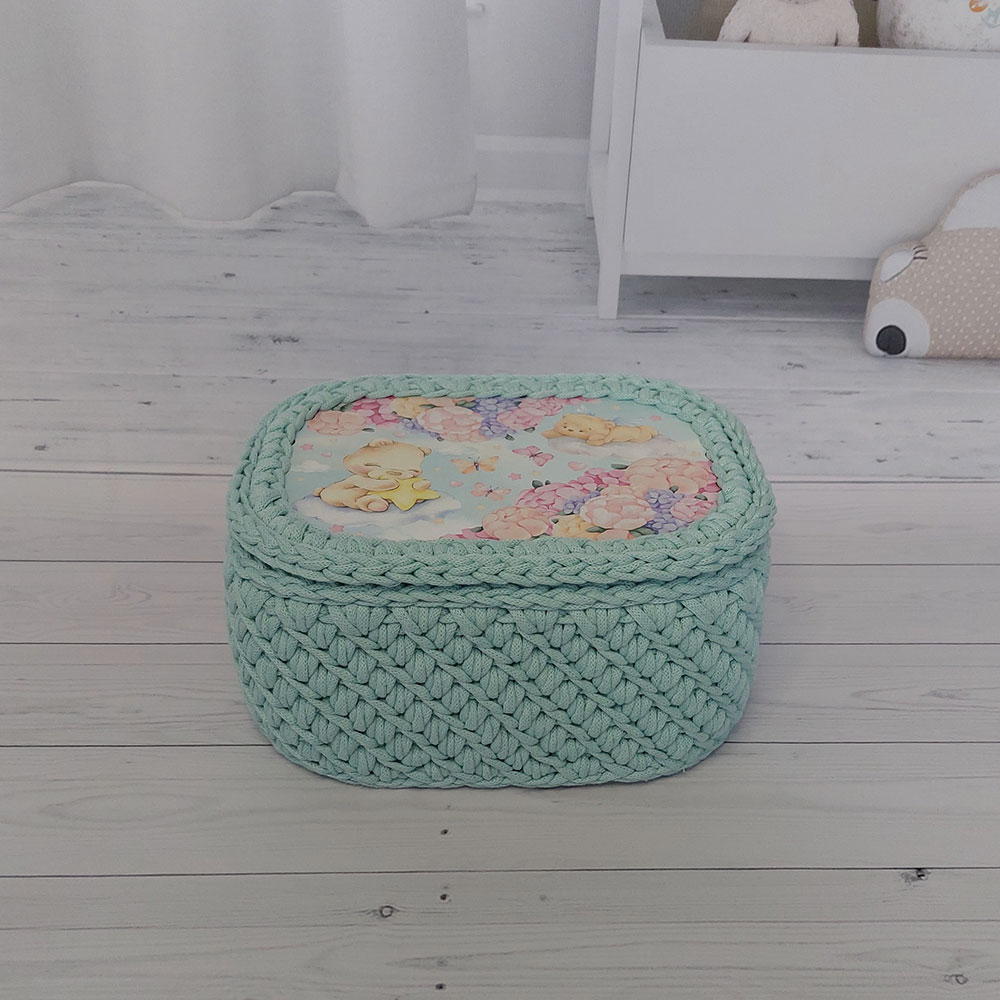 Basket with wooden lid -Hand crocheted basket made of 4mm cotton cord with a plywood lid and bottom. Perfect for creating a cosy space in baby’s room. You can store various items in it for example, diapers, baby’s cream, socks, toys, books etc. The eco-friendliness makes it a great addition to the baby’s room. Excellent as a baby shower gift for your loved ones or for yourself.