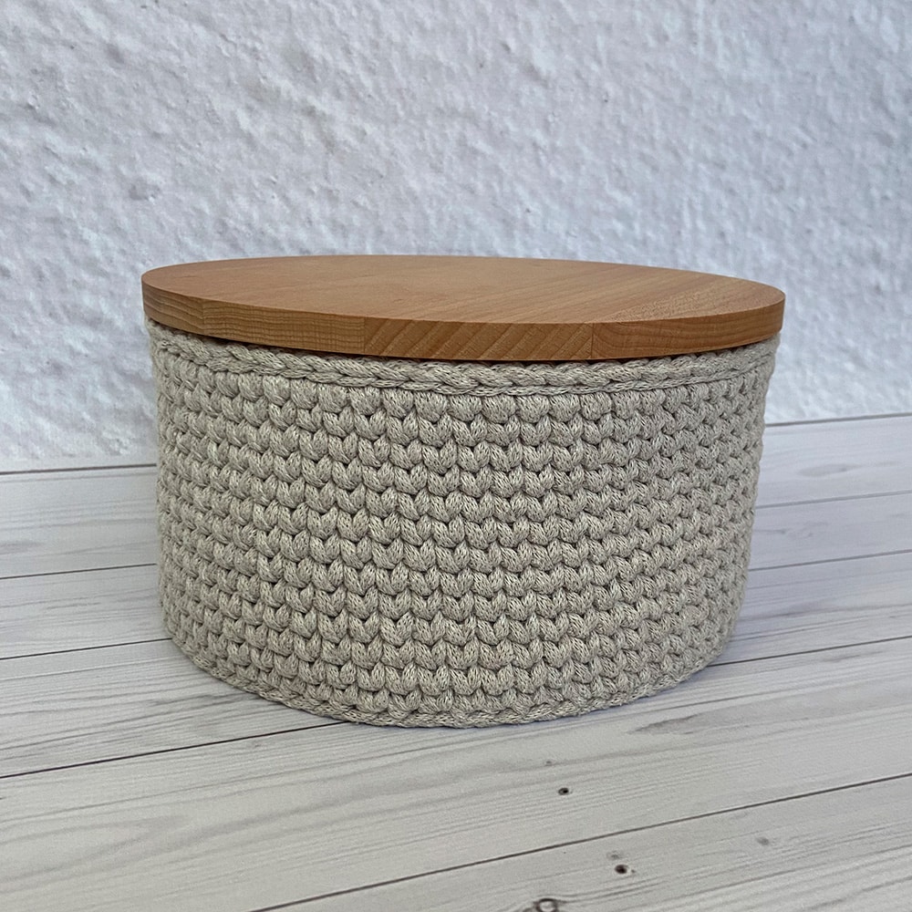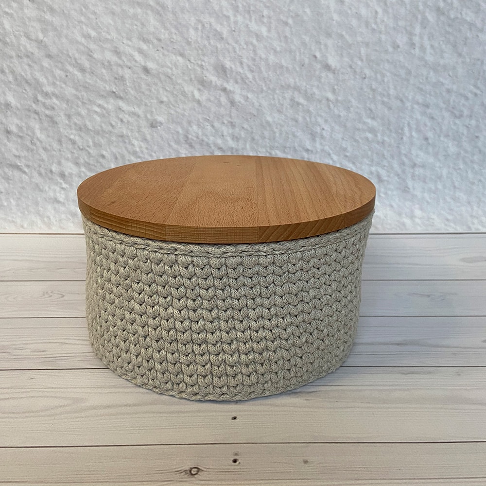 Round Basket with wooden lid – Hand crocheted basket made of 4mm cotton cord with a beechwood lid. Perfect for creating a cosy home space. You can store various items or food in it. The eco-friendliness makes it a great addition to your kitchen and other spaces. Excellent as a gift for your loved ones or for yourself.